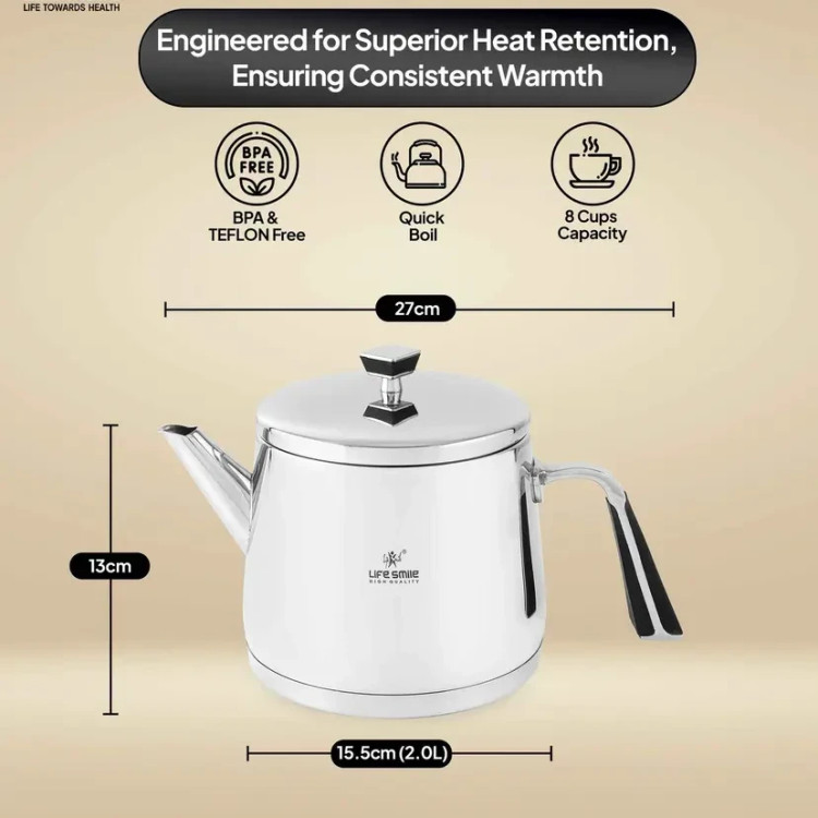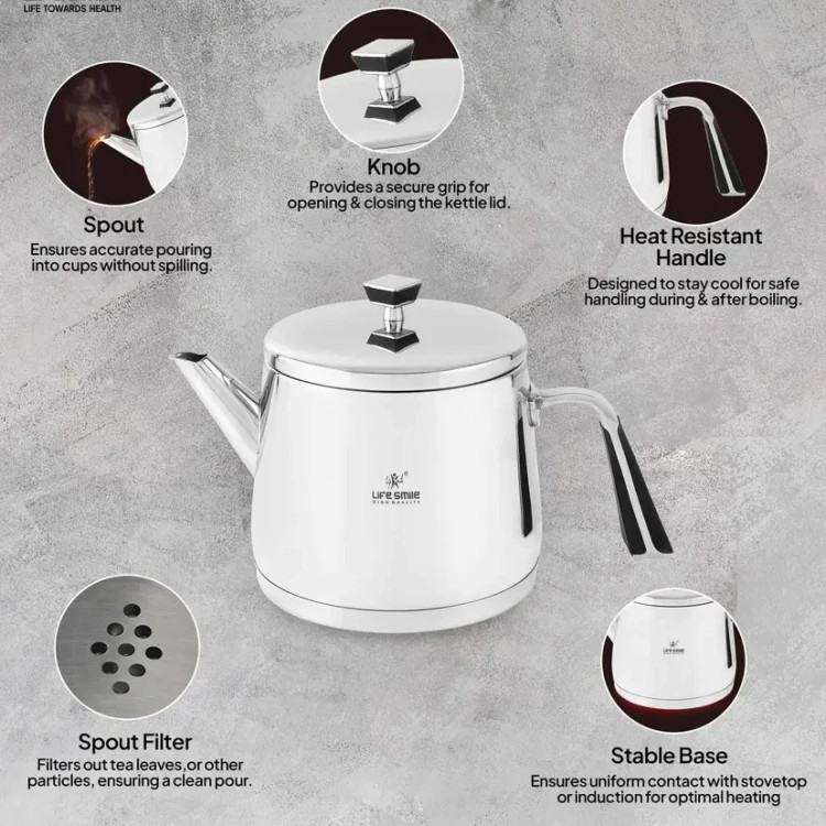 کتری لایف اسمایل با طراحی بسیار زیبا، به آشپزخانه شما جلوه خاصی میدهد. این ست که از جنس استیل ضد زنگ 18/10 ساخته شده، دارای بدنه صاف و برق است که زیبایی آن را دو چندان کرده است. وجود نیکل و کروم در این استیل به مقاومت و استحکام کتری و قوری کمک کرده است. گنجایش کتری برابر 2 لیتر بوده که این ست برای یک خانواده پرجمعیت مناسب میکند. کتری دارای درب مخصوص استیل است. کف کتری به صورت کپسولی طراحی شده که به انتقال همگن حرارت کمک خواهد کرد و در زمان و هزینه شما صرفهجویی میکند. دهانه ورودی کتری بزرگ می باشد که پرکردن و همچنین تمیز کردن آن را راحت کرده است. این محصول قابلیت استفاده بر روی بیشتر اجاقها از جمله اجاق معمولی، هالوژن، سرامیک را داشته و همچنین با برخورداری از پایه القایی میتوان آن را بر روی اجاقها برقی نیز قرار داد.
