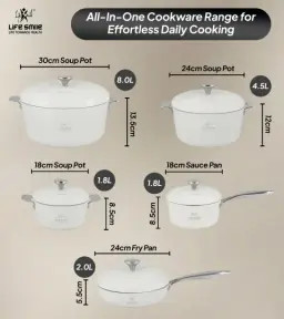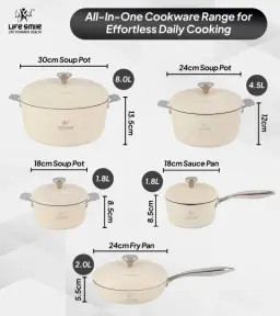 * **تعداد بیشتر (۱۰ پارچه):** مجموعه کاملتری شامل قابلمه و تابه در ۵ سایز مختلف (۱۸، ۲۴ و ۳۰ سانتیمتر) برای کاربردهای گستردهتر.