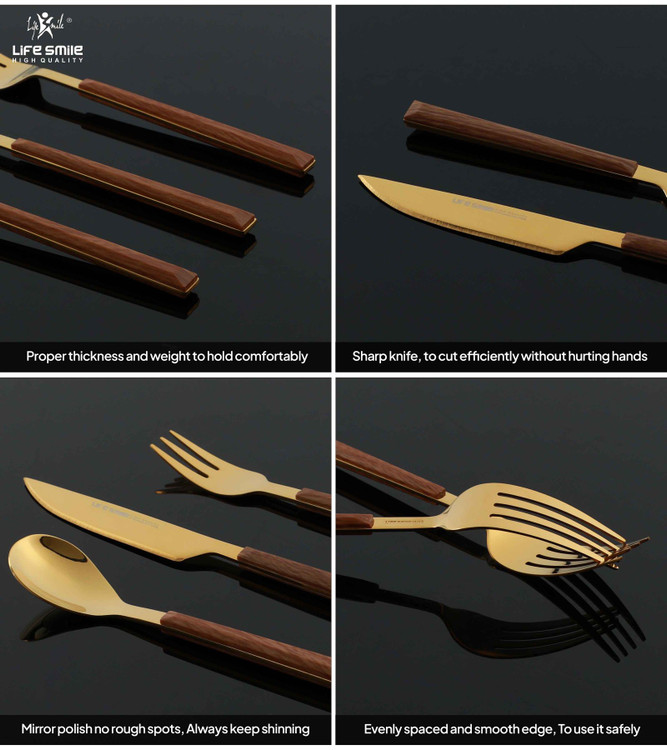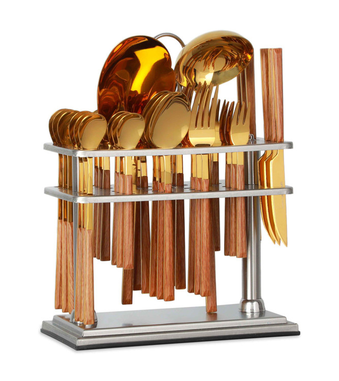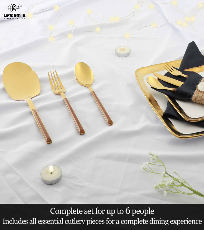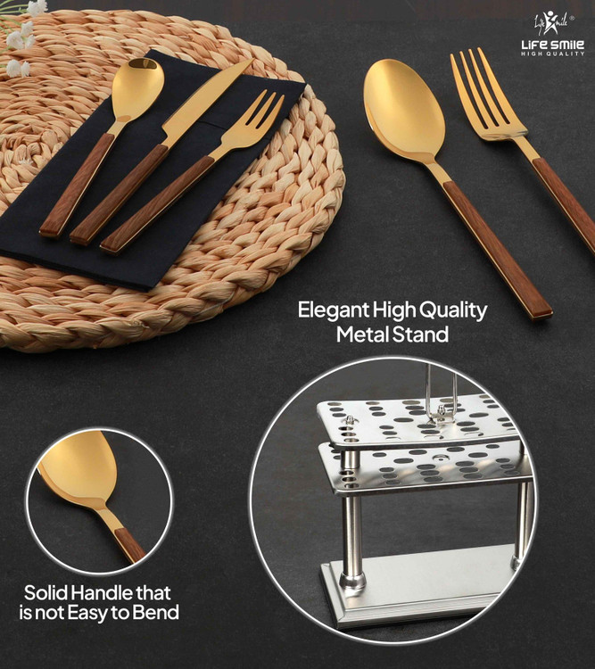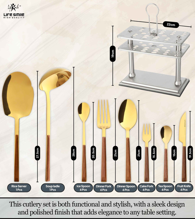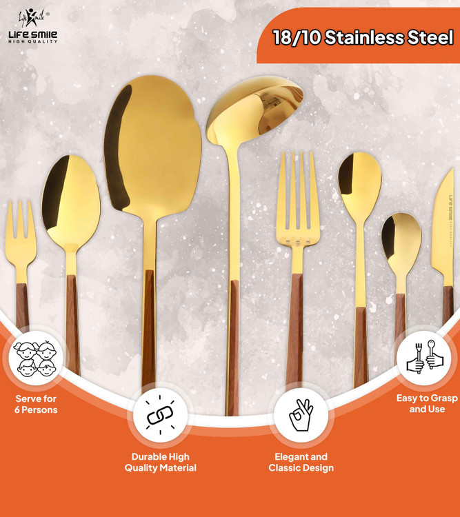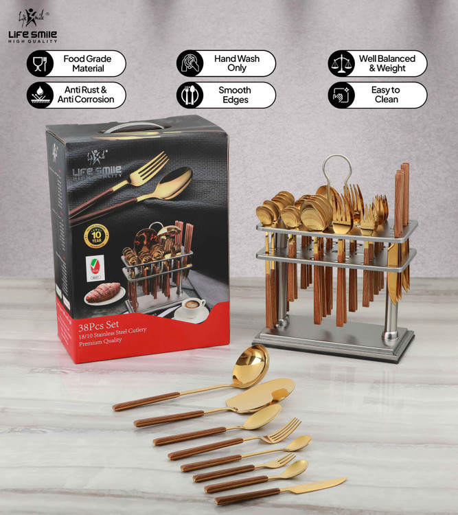 سرویس قاشق و چنگال لایف اسمایل 38 پارچه پایهدار بدنه استیل طلایی رنگ و دسته سرامیکی طرح چوب