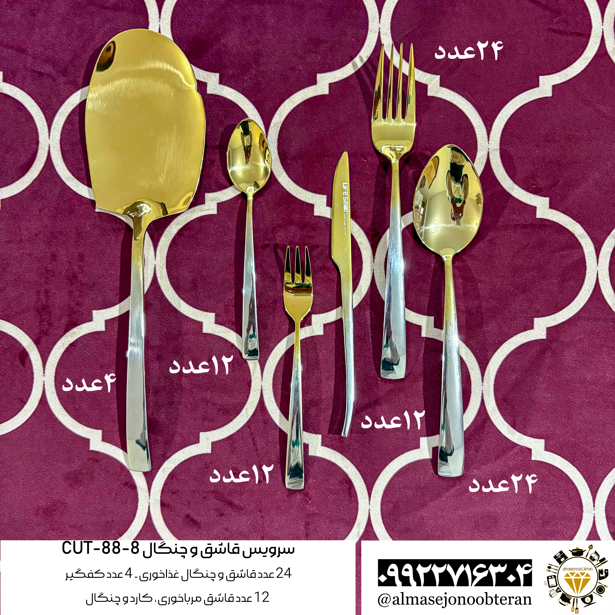 سرویس قاشق و چنگال 88 پارچه 24 نفره، طلایی نقرهای، لایف اسمایل مدل CUT-88-8