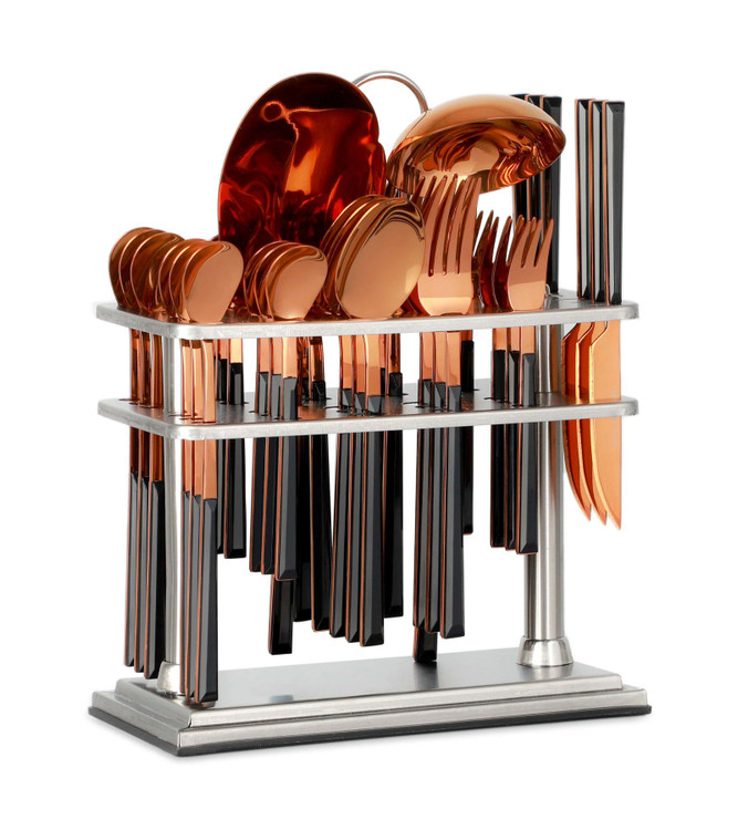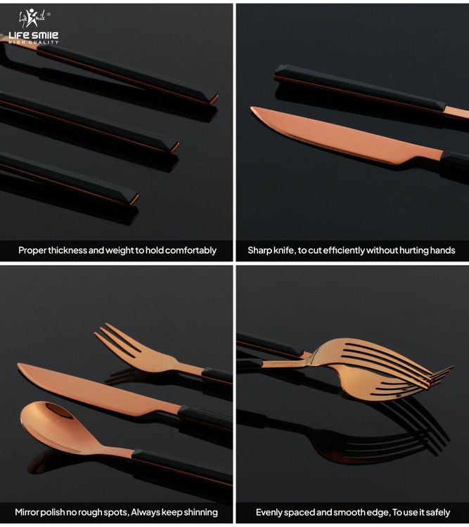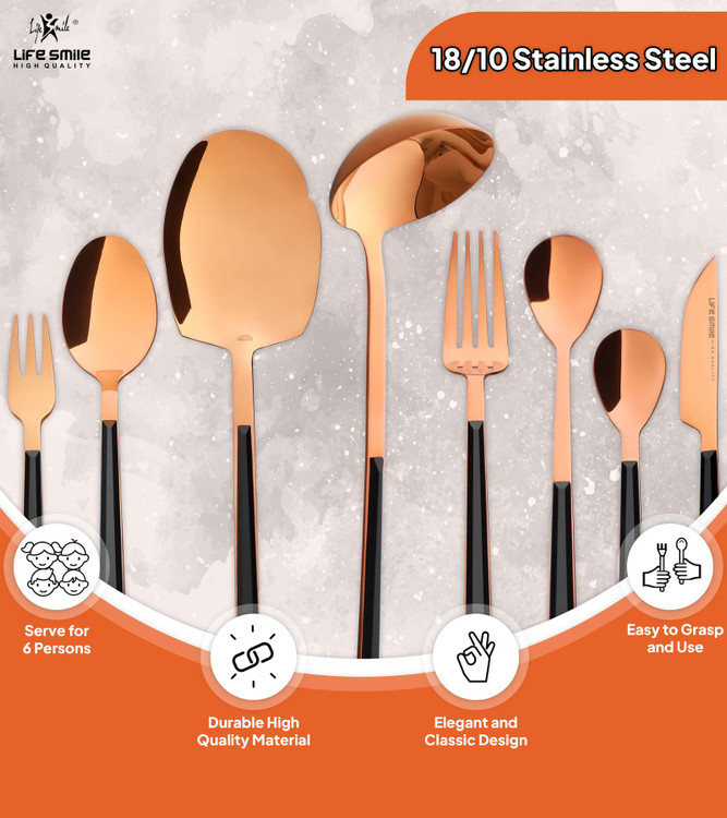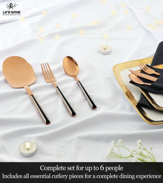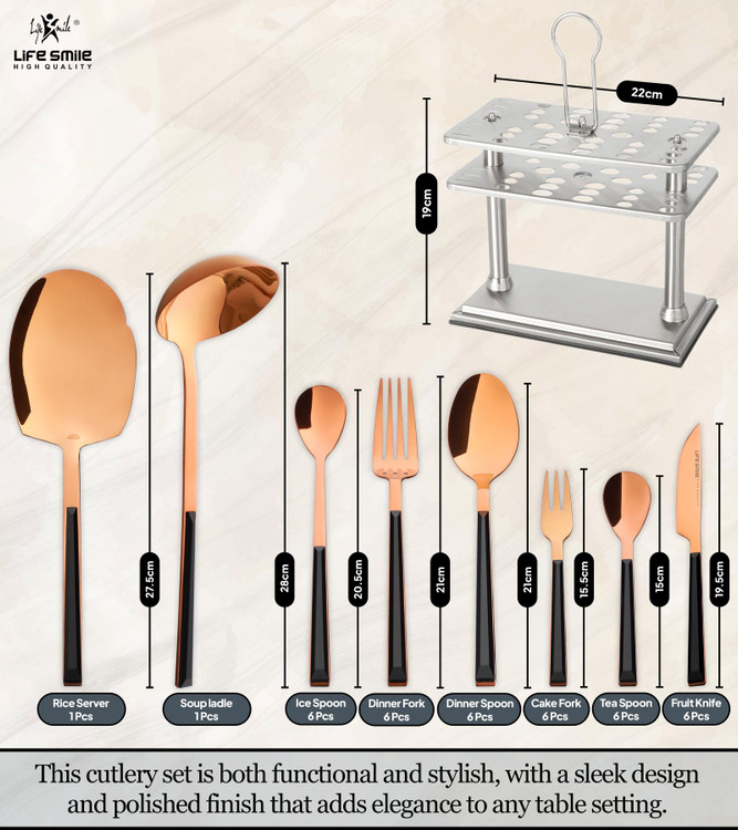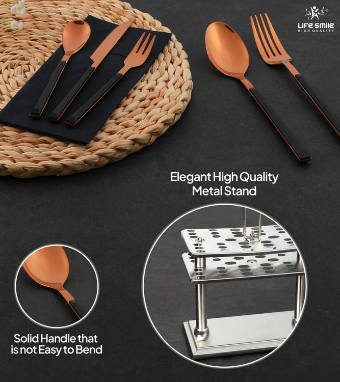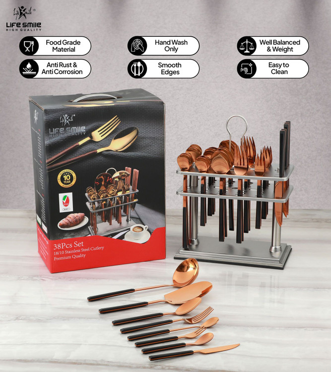 سرویس قاشق و چنگال لایف اسمایل 38 پارچه پایهدار بدنه استیل رنگ مسی و دسته سرامیکی